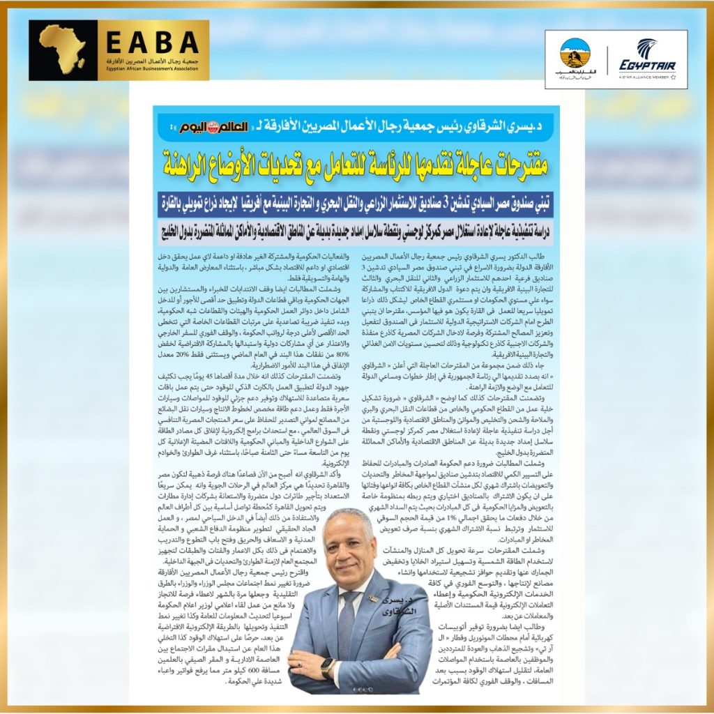 وأوضح الشرقاوي أن من بين المقترحات العاجلة إنشاء صناديق استثمارية متخصصة في مجالات الزراعة والنقل البحري والتجارة البينية مع أفريقيا، بما يسهم في تعزيز الأمن الغذائي وتسهيل حركة التجارة وفتح أسواق جديدة أمام الشركات المصرية.